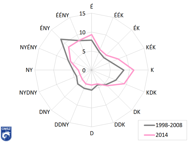 egymást erősítő hatásában keresendő. A 2014-es viszonyok nagyobb különbséget mutatnak a fentiekhez képest. Nagyobb arányban jelentkezett a kelet-délkeleti irány, valamint az északi irány is. Kisebb relatív gyakoriság jellemezte