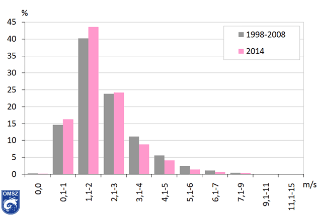 vagyis a kisebb szélsebességek fordulnak elő gyakrabban. Az erősebb szelek ritkábbak, viszont nagyon nagy értékek is felléphetnek. A 2014-es eloszlás jól követte a normál értékeket. A 2014-es relatív gyakoriság az 1.1–2 m/s-os