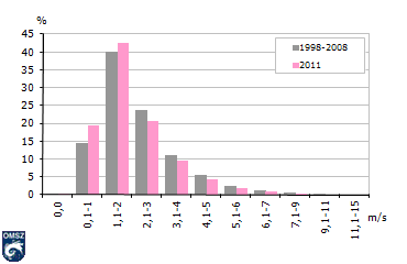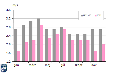 Országos átlagban a szélsebesség évi átlaga 2-4 m/s között változnak, ez alapján hazánk mérsékelten szeles területnek minősül. A havi átlagos szélsebesség éves menetében (16. ábra) általában áprilisban jelentkezik a maximum, míg a legalacsonyabb értékeit augusztus és október között veszi fel. 2011-ben a sokévi átlagos menethez hasonlóan április hónap bizonyult a legszelesebbnek az évben, másodikként a július emelkedett ki. A pestszentlőrinci állomás 2011-es havi átlagos szélsebességét az 1971-2000-es normál százalékában nézve (17. ábra) elmondhatjuk, hogy mindegyik hónap átlag alatti volt, sőt az őszi és téli hónapok jóval alumaradtak az ilyenkor szokásoshoz képest. A legnagyobb különbségek és egyben a legalacsonyabb átlagos szélsebességek januárban, illetve novemberben jelentkeztek (mindkét hónap értéke a sokévi átlag csupán 63%-a).