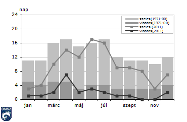 A szélviszonyokat jellemző küszöbnapok éves menetét a 19. ábrán mutatjuk be. Mind a szeles (f≥10m/s), mind a viharos napok (f≥15 m/s) esetében megjelent a január-áprilisi emelkedő tendencia, de a szokásos áprilisi maximum csak a viharos napok esetében esett erre a hónapra, 2011-ben a legtöbb szeles napot júniusban figyeltük meg, az április csak harmadikként jelentkezett (a július után). A sokéves átlaghoz való viszonyokat tekintve láthatjuk, hogy a maximumot felvett hónapokon kívül mindkét karakterisztika átlag alatt alakult, a legnagyobb negatív eltérések a szeles napok esetében (20. ábra) januárban és novemberben jelentkeztek, míg viharos napok esetében (21. ábra) október-novemberben, mely két hónap alatt nem is figyeltünk meg 15 m/s feletti szélsebességet.