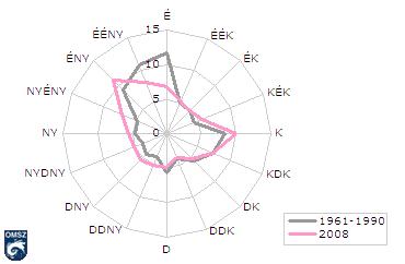>A szélirány gyakorisági eloszlását láthatjuk a 22. ábrán Budapest-Pestszentlõrinc 1961-1990 és 2008. évi adatai alapján. Az ábra jól mutatja, hogy Budapest esetében érvényre jut az Atlanti-óceán és a Földközi-tenger felõl érkezõ ciklonok által meghatározott északnyugati szélirány. A keleties szélirány hangsúlyozottabb megjelenésének oka a városi hõsziget hatás, valamint a Duna és a Pesti-síkság közötti helyi légkörzés egymást erõsítõ hatásában keresendõ.