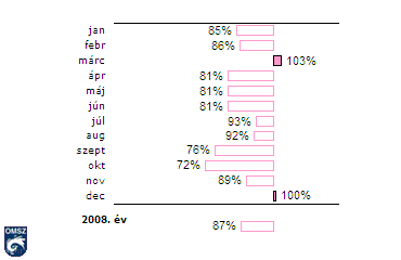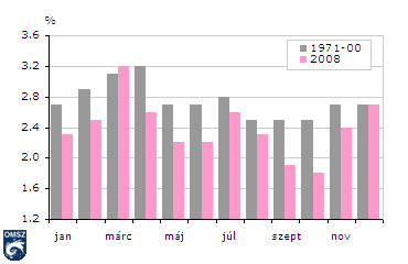 A szokásosnál sokkal kevésbé volt szeles a 2008. év idõjárása Budapest-Pestszentlõricen, az évi menet megközelítõen a sokévi átlagnak megfelelõen alakult. Az év legszelesebb hónapja a március volt (17. ábra). A legkisebb havi átlagos szélsebességet pedig októberben regisztrálták - ezen hónap átlagos szélsebessége kétharmada volt a sokévi átlagértéknek.