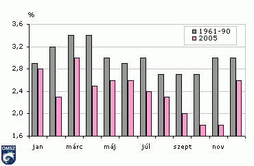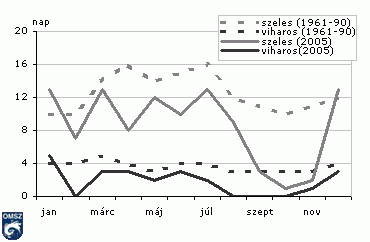 A 17. ábra alapján elmondhatjuk, hogy a szokásosnál sokkal kevésbé volt szeles a 2005. év idõjárása Budapest-Pestszentlõricen, és az évi menet sem a sokévi átlagnak megfelelõen alakult. A tavaszi maximum márciusra tolódott, de értéke így is elmaradt a sokévi átlagtól, a nyári másodmaximum május-júniusban következett be. Az õsz végén általában tapasztalható nagyobb szélsebességek 2005-ben õsszel nem, csak decemberben jelentkeztek.