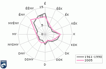 A szélirány gyakorisági eloszlását láthatjuk a 22. ábrán Budapest-Pestszentlõrinc 1961-90 és 2005. évi adatai alapján. Az ábra jól mutatja, hogy Budapest esetében érvényre jut az Atlanti-óceán és a Földközi-tenger felõl érkezõ ciklonok által meghatározott északnyugati szélirány. A keleties szélirány hangsúlyozottabb megjelenésének oka a városi hõsziget hatás, valamint a Duna és a Pesti-síkság közötti helyi légkörzés egymást erõsítõ hatásában keresendõ.