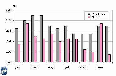 A 17. ábra alapján elmondhatjuk, hogy a szokásosnál sokkal kevésbé volt szeles a 2004. év idõjárása Budapest-Pestszentlõricen, és az évi menet sem a sokévi átlagnak megfelelõen alakult. A tavaszi maximum februárra tolódott, de értéke így is elmaradt a sokévi átlagtól, a nyári másodmaximum májusban következett be. Az õsz végén általában tapasztalható nagyobb szélsebességek 2004-ben fokozottan jelentkeztek, novemberben - az év egyetlen átlagosnál szelesebb hónapjában - az átlagos szélsebesség a februári elsõdleges maximummal azonos értéket vett fel, 3,1 m/s volt.