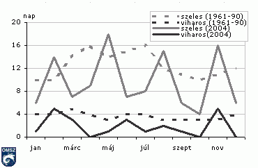 2004-ben (18. ábra) az 1,1-2,0 m/s-os leggyakoribb- és a 2,1-3,0 m/s-os illetve 3,1-4,0 m/s-os értékköz az ötévi átlagénál is többször fordult elõ. Kevesebbszer mértek viszont 2004-ben 1 m/s-nál gyengébb szelet. A szeles- (>=10m/s) és a viharos (>=15 m/s) napok száma többnyire átlag alatt maradt (19. ábra).