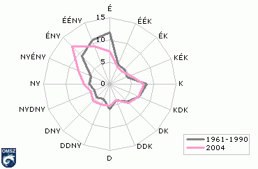 A szélirány gyakorisági eloszlását láthatjuk a 22. ábrán Budapest-Pestszentlõrinc 1961-90 és 2004. évi adatai alapján. Az ábra jól mutatja, hogy Budapest esetében érvényre jut az Atlanti-óceán és a Földközi-tenger felõl érkezõ ciklonok által meghatározott északnyugati szélirány. A keleties szélirány hangsúlyozottabb megjelenésének oka a városi hõsziget hatás, valamint a Duna és a Pesti-síkság közötti helyi légkörzés egymást erõsítõ hatásában keresendõ.