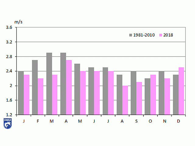 Megfigyeléseink szerint 2018-ban a talaj közelében az állomásokon mért szélsebesség évi átlaga 1,1-6,0 m/s között változott, országos átlagban 2,3 m/s adódott. Budapest Pestszentlőrinc állomáson a havi átlagos szélsebesség éves menetében (18. ábra) általában márciusban és áprilisban jelentkezik a maximum, míg a legalacsonyabb értékeit októberben veszi fel. 2018-ban a havi átlagos szélsebesség áprilisban volt a legnagyobb (2,7 m/s), melyet a decemberben (2,5 m/s) mért érték követ. A legalacsonyabb havi átlagos szélsebesség augusztusban adódott (2,0 m/s) a várt októberi szélminimum helyett.