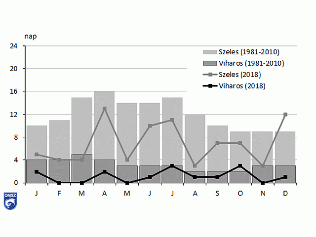 A szélviszonyokat jellemző küszöbnapok éves menetét a 21. ábrán mutatjuk be. A legtöbb szeles napot (napi maximális széllökés (fx) ≥ 10 m/s) áprilisban (13 nap), második helyen decemberben (12 nap) jegyeztük, a legkevesebbet pedig augusztusban és novemberben (3 nap). Viharos napból (fx ≥ 15 m/s) júliusban és októberben fordult elő a legtöbb (3 nap). A sokévi átlagokkal összevetve Budapest Pestszentlőrinc állomásunkon a legtöbb hónap elmaradt a normáltól mind a szeles, mind a viharos napok számában. A szeles napok száma csupán decemberben haladta meg a megszokott értékeket, míg a legnagyobb negatív anomália 2018-ban augusztusban adódott (22. ábra). Éves összegben Budapesten 40%-kal kevesebb szeles nap fordult elő, mint az 1981-2010-es sokévi átlag.