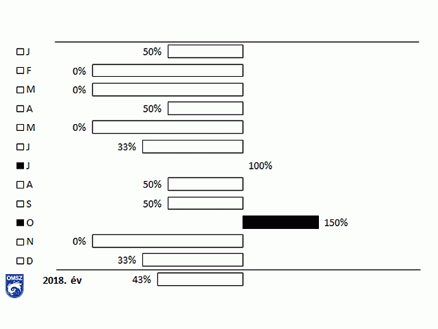 A viharos napok számában még nagyobb különbségeket láthatunk (23. ábra). Budapest Pestszentlőrincen havonta 2-5 viharos napra (fx ≥ 15 m/s) számítunk a sokévi átlagok alapján, a legtöbb 1981-2010 között márciusban volt jellemző. A várakozásainkkal szemben 2018-ban négy hónapban (február, március, május és november) egyáltalán nem jegyzetünk 15 m/s-nál nagyobb szélsebességet a talaj közelében. Ugyanakkor júliusban a sokévi átlagnak megfelelő értéket, míg októberben a sokévi átlag 50%-kal magasabb érték fordult elő. Összességében éves átlagban Budapest Pestszentlőrincen 57 %-kal kevesebb viharos napot regisztráltuk 2018-ban.
