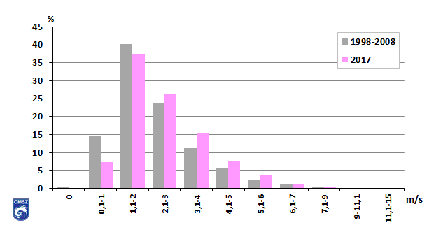 Megfigyeléseink szerint 2017-ben a talaj közelében az állomásokon mért szélsebesség évi átlaga 1,3-6,7 m/s között változott, országos átlagban 2,5 m/s adódott. A havi átlagos szélsebesség éves menetében (18. ábra) általában márciusban és áprilisban jelentkezik a maximum, míg a legalacsonyabb értékeit októberben veszi fel. 2017-ben a havi átlagos szélsebesség Budapest-Pestszentlőrinc állomáson áprilisban volt a legnagyobb (3,1 m/s), melyet a decemberben (3 m/s), majd júniusban (2,8 m/s) mért érték követ. A legalacsonyabb havi átlagos szélsebesség januárban és februárban adódott a várt október helyett.