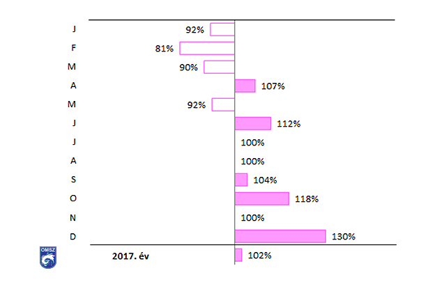 A 19. ábrán jól látható, hogy 2017 első felében májusig a szélsebesség havi átlagértékei jellemzően elmaradnak az 1981-2010-es sokévi átlagtól. A nyári hónapok július, augusztus és ősszel november volt átlagosan szeles. A legnagyobb pozitív eltérés októberben és decemberben mutatkozott meg: októberben 18 %-kal, decemberben 30 %-kal volt nagyobb a szélsebesség a szokásosnál. Összességében elmondható, hogy Budapest-Pestszentlőrinc állomáson az átlagos évi szélsebesség 2017. évben a sokévi átlagnak megfelelően alakult.