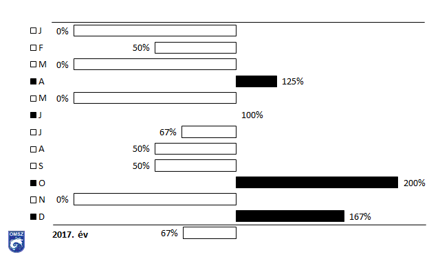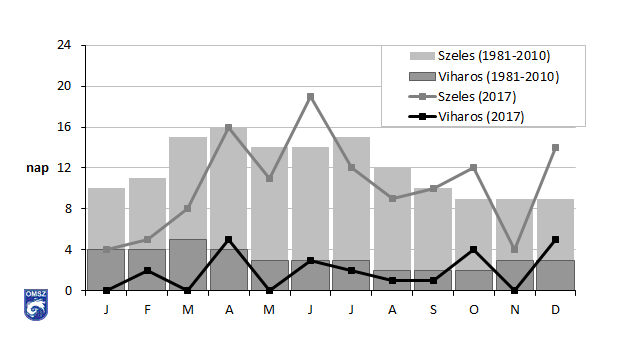 A szélviszonyokat jellemző küszöbnapok éves menetét a 21. ábrán mutatjuk be. A legtöbb szeles napot (napi maximális széllökés (fx) ≥ 10 m/s) júniusban (19 nap), második helyen áprilisban (16 nap) jegyeztük, a legkevesebbet pedig januárban és novemberben (4 nap). Viharos napból (fx ≥ 15 m/s) áprilisban és decemberben fordult elő a legtöbb (5 nap). A sokévi átlagokkal összevetve Budapest-Pestszentlőrinc állomásunkon a legtöbb hónap elmaradt a normáltól mind a szeles, mind a viharos napok számában. A szeles napok száma csupán három hónapban: júniusban, októberben és decemberben haladta meg a megszokott értékeket, míg a legnagyobb negatív anomália 2017-ben januárban adódott (22. ábra). Áprilisban (16 nap) és a szeptemberben (10 nap) a szeles napok száma az 1981-2010-es sokévi átlaggal megegyezett. A viharos napok számában még nagyobb különbségeket láthatunk (23. ábra). Budapest-Pestszentlőrincen havonta 2-5 viharos napra (fx ≥ 15 m/s) számítunk a sokévi átlagok alapján, a legtöbb 1981-2010 között márciusban volt jellemző. A várakozásainkkal szemben 2017-ben négy hónapban (január, március, május és november) egyáltalán nem jegyzetünk 15 m/s-nál nagyobb szélsebességet a talaj közelében. Ugyanakkor áprilisban 25 %-kal, decemberben 67%-kal több viharos nap, míg októberben a sokévi átlag duplája fordult elő. Összességében éves átlagban Budapest-Pestszentlőrincen 33 %-kal kevesebb viharos napot regisztráltuk 2017-ben.