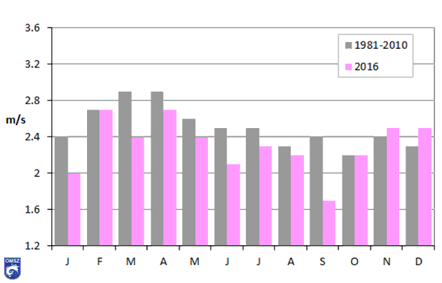 Megfigyeléseink szerint 2016-ban országos átlagban a talaj közeli szélsebesség évi átlaga 2-3,5 m/s között változott. A havi átlagos szélsebesség éves menetében (18. ábra) általában márciusban és áprilisban jelentkezik a maximum, míg a legalacsonyabb értékeit augusztusban, októberben és decemberben veszi fel. 2016-ban a havi átlagos szélsebesség Budapest-Pestszentlőrinc állomáson februárban és áprilisban volt a legnagyobb, melyet a novemberi és decemberi átlag követ. Általánosságban elmondható, hogy csupán két hónapban (november és december) haladta meg a 2016-os átlagérték a normált. Leginkább a januári, és a szeptemberi értékek maradnak el a szélsebességek megszokott havi átlagaitól.