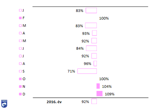 A 19. ábrán jól látható, hogy 2016-ban februárban és októberben a szélsebesség havi átlagértékei megegyeztek a sokévi átlaggal. A legnagyobb eltérés októberben mutatkozott meg, a szokásos szélsebesség 71%-át jegyeztük. Összességében elmondható, hogy a 2016. évre vonatkozóan egy kicsivel gyengébb légmozgás volt jellemző a sokéves átlaghoz képest.
