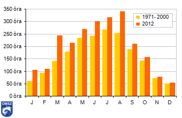 élvezhettünk, ami a sokéves átlagnak 124%-a. A legtöbb napsütés általában júliusban jellemző, összesen 267 óra, 2012-ben azonban az augusztus megelőzte