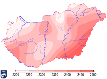 A napsütéses órák száma hazánk területén általában 1750 és 2050 óra között változik. A 2011. évi térképre tekintve látható (25. ábra), hogy az évben a legkisebb értékek is meghaladták a szokásos felső értékhatárt. Az évi maximum a 2500 órát is átlépte, összesen 2504 óra volt, melyet Békéscsabán mértünk. Az érték ezzel a mérések sorában a második helyre került, csupán a 2000-ben, Szarvason mért 2522 óra előzi meg.