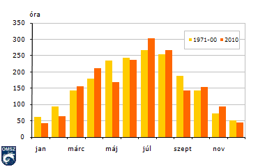 2010-ben országos átlagban mintegy 1885 órán át sütött a nap, mely csupán 2%-kal maradt el az 1971-2000-es átlagértéktől. A napfénytartam-összegeket havi bontásban a 23. ábra szemlélteti. A legnagyobb érték a sokéves átlagnak megfelelően júliusban jelentkezett, a legkisebb januárban, ami viszont általában decemberben jellemző. További különbség az éves menetben a májusban és szeptemberben megjelenő törés. A két hónap szokatlanul alacsony napfénytartama a rendkívül csapadékos hónapok borús időjárásával magyarázható. Arányaiban a sokéves átlagokhoz képest (24. ábra) a legborúsabb hónap mégis a február volt, a legnaposabb pedig a november.