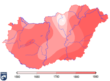Hazánkban a sokéves átlagot tekintve a napfénytartam területi eloszlását északnyugat - délkelet irányú növekedés jellemzi, éves összege mintegy 1750 és 2050 óra között változik. Ehhez képest az elmúlt évben a legkevesebb napsütést a Duna-Tisza-köze élvezte (25. ábra). A legborultabbnak 1580 óránál alacsonyabb napfénytartammal a Mátra térsége bizonyult, Kékestető állomásunkon 1575 órát regisztráltunk. A legtöbb napfényes óra az ország keleti felében rajzolódott ki, a legnaposabb állomás Szeged külterület volt 2034 órával.
