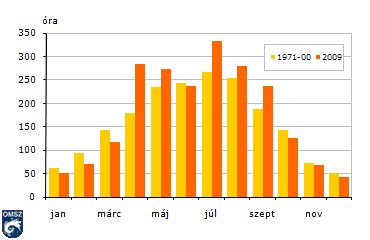 A napsütéses órák havi összegei 2009-ben és 1971-2000 között