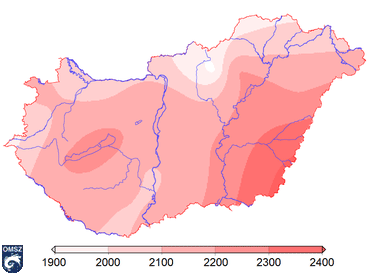 A sokéves átlagot tekintve hazánkban a napfénytartam éves összege mintegy 1750 és 2050 óra között változik, területi eloszlását jó közelítéssel északkelet - délnyugat irányú növekedés jellemzi. A 2009-es képet tekintve (25. ábra) hasonló elrendezõdést láthatunk. A legtöbb napsütést 2009-ben Békés megye élvezhette, de értékeiben jóval meghaladja a szokásost, hiszen ezen a területen több mint 2400 órán át sütött a nap. A vártnak megfelelõen az ország északkeleti része volt a legborultabb.