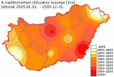 Hazánk területén a napfénytartam éves összege átlagosan 1750 és 2050 óra között alakul. A napsütéses órák éves összege 2005-ben 1820 és 2260 óra között váltakozott az ország területén, az átlagosan 2051 óra 4%-kal haladja meg az 1961-90-es átlagértéket (24. ábra). Általában a Dél-Alföldön és Baranyában éri el a maximumát a napfénytartam, míg minimuma az Alpokalján és az ország északkeleti részén van. A napsütéses órák számának 2005. évi eloszlását mutatja az 25. ábra. A legnaposabb területek a Tiszántúl délkeleti felében voltak, míg a legalacsonyabb értékeket az északkeleti határ mentén mérték.