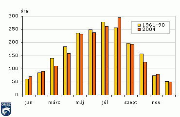 A napsütéses órák havi összegei 2004-ben és 1961-90 között