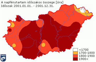 Magyarországon éghajlati viszonylatban a napfénytartam évi összege mintegy 1750 és 2050 óra között változik. A napsütéses órák évi összege 2001-ben 1600 és 2050 óra között volt, átlagosan 1900 óra. Ez az érték az 1961-1990 évek átlagának 97 %-a.