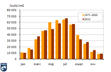 A Napból közvetlenül érkező direkt sugárzás és az égbolt minden részéről érkező szórt vagy másképp diffúz sugárzás együttesét nevezzük globálsugárzásnak. Értéke összefüggést mutat a napfénytartammal, ennek megfelelően májusban itt is markáns eltérés jelentkezett. Szeptemberben viszont bár az érték szintén átlag alatti, a különbség már kevésbé szembetűnő, mint a napsütéses órák esetében. A szokásos januártól júliusig emelkedő majd a júliustól decemberig csökkenő tendenciát a 2010-es értékek is hozták.