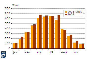 A globálsugárzás a Napból érkezõ közvetlen sugárzás és az égbolt minden részérõl érkezõ szórt sugárzás összege. A 26. ábrán a sokévi átlag az 1971-2000 közötti 30 év adatai alapján készült. A 2008. évi menet futása természetszerûleg emlékeztet a napsütéses órák havi összegének menetére (23. ábra), maximuma 2008-ban májusban volt, nem sokkal megelõzve augusztust.