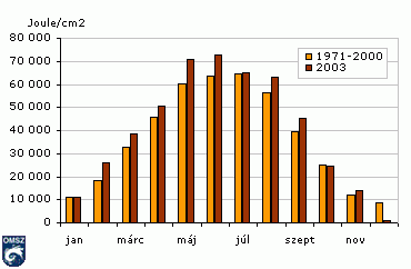 A globálsugárzás a Napból érkezõ közvetlen sugárzás és az égbolt minden részérõl érkezõ szórt sugárzás összege. Mérése 1967-ben kezdõdött, ezért az 21. ábrán a sokévi átlag az 1971-2000 közötti 30 év adatai alapján készült. A 2003. évi menet futása természetszerûleg emlékeztet a napsütéses órák havi összegének menetére (15. ábra).