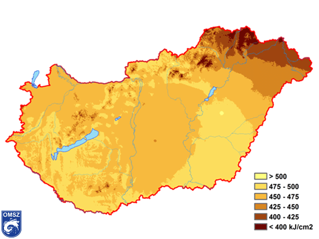A 29. ábra a globálsugárzás területi eloszlását mutatja be. Látható, hogy a DK-i régióban érte el legmagasabb értékeit (500 kJ/cm2 felett), a magasabban fekvő területeken, közöttük is főleg ÉK-en pedig minimumát