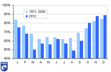 A relatív nedvesség havi átlaga Budapest-Pestszentlőrincen 2012-ben és az 1971-2000-es átlagértékek (%)
