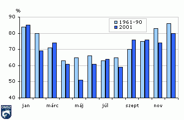 A relatív nedvesség havi átlaga Budapest-Pestszentlõrincen 2001-ben az 1961-90-es normál százalékában