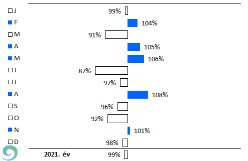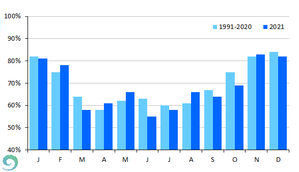 2021-ben Budapest Pestszentlőrincen a legalacsonyabb havi átlagos relatív nedvesség júniusban (55%) volt, ekkor jórészt derült, tartósan csapadékmentes időjárás uralkodott. A legmagasabb érték ezúttal a ködös, borús időjárású novemberben (83%) adódott, de a december (82%) és a január (81%) szorosan követte. Mind a három hónapot az átlagnál nedvesebb, frontokban gazdag időjárás jellemezte. Az év egészét tekintve a relatív nedvesség éves szinten átlagosnak tekinthető (29. ábra). A legnagyobb arányú pozitív eltérést augusztusban tapasztaltuk (108%), amikor a normálnál hűvösebb volt az időjárás. A legnagyobb negatív anomália a rekord meleg és száraz júniusban jelentkezett (87%), melyet a március (91%) és az október (92%) követett.