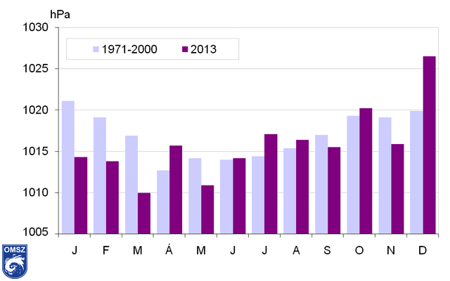 A havi átlagos légnyomás értékek alapján a nagytérségű nyomási képződmények gyakoriságára következtethetünk. A szokásoshoz képest jóval nagyobb érték jelentkezett decemberben, mely anticiklonális helyzetek uralmát jelzi – ugyanez a decemberi, mindössze 3.5 mm-es országos átlagos csapadékösszegben is tetten érhető, mellyel 2013 decembere a 2. legszárazabbnak minősül hazánkban 1901 óta. Márciusban szembetűnően alacsony átlagos légnyomás volt jellemző, mely intenzív ciklontevékenységre utal (30. ábra) – hazánk 2. legcsapadékosabb márciusát jegyeztük 1901 óta. Jelentős különbség adódott még januárban és februárban is, mely szintén megmutatkozott a havi nagy csapadékösszegekben is.