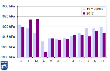 A havi átlagos légnyomás értékek alapján a nagytérségű nyomási képződmények gyakoriságára következtethetünk. A szokásoshoz képest jóval nagyobb értékek