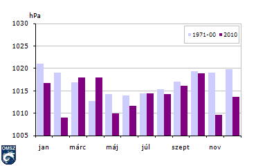 A havi átlagos légnyomás értékek alapján a nagytérségű nyomási képződmények gyakoriságára következtethetünk. Eszerint a pestszentlőrinci mérések alapján 2010-ben a ciklonaktivitás, melyre az alacsony nyomási értékek utalnak, februárban és novemberben volt a legintenzívebb, holott általában az április szokta mutatni a legalacsonyabb átlagos nyomási értéket. A májusi ciklonaktivitásról tanúskodik a szintén alacsony 1010 hPa is. A szokásoshoz képest kiemelkedően nagy nyomás, azaz anticiklonális helyzet jellemezte az áprilist. Hasonlóan magas nyomás jelentkezett márciusban és októberben is, de ebben a két hónapban ezek az értékek átlag körülinek számítanak. A maximum általában januárban jelentkezik, 2010-ben viszont ez októberre esett.