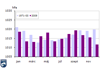 A havi átlagos légnyomás értékek a nagytérségû nyomási képzõdmények gyakoriságára engednek következtetni. Az anticiklon a pestszentlõrinci mérések sokéves átlaga alapján (29. ábra) januárban a leggyakoribb, tavaly viszont szeptemberben volt a legjellemzõbb a magas nyomás, amikor többnyire szubtrópusi anticiklon határozta meg hazánk idõjárását. Általában áprilisban mérjük a legalacsonyabb légnyomást, 2009-ben viszont a szokatlan ciklonális aktivitás miatt decemberben állt be a minimumérték. A légnyomásértékek általában jól közelítették az átlagot, 5 hónapban adódott a szokásosnál nagyobb érték. A legnagyobb pozitív eltérés májusban jelentkezett, míg a fentiekkel összhangban a legnagyobb negatív anomália decemberben volt.