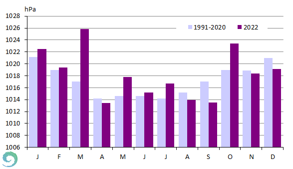 A havi átlagos légnyomás értékek alapján a nagytérségű nyomási képződmények gyakoriságára következtethetünk. 2022-ben Budapest Pestszentlőrincen a tengerszinti légnyomás havi átlaga márciusban és októberben jelentősen a normál felett alakult, de januárban, februárban, és májustól júliusig is meghaladta az 1991-2020-as átlagot. Ezeket az anomáliákat télen gyakran hidegpárnás helyzetek, míg tavasztól őszig a tartósan fennmaradó anticiklonális helyzetek okozzák. Az átlagosnál alacsonyabb légnyomásértékek adódtak áprilisban, szeptemberben és decemberben, az ilyen irányú eltérés általában az alacsony nyomású légköri képződmények nagyobb gyakoriságára utal (30. ábra), így nem meglepő, hogy ezek voltak a csapadékosabb hónapok a 2022-es év során.
