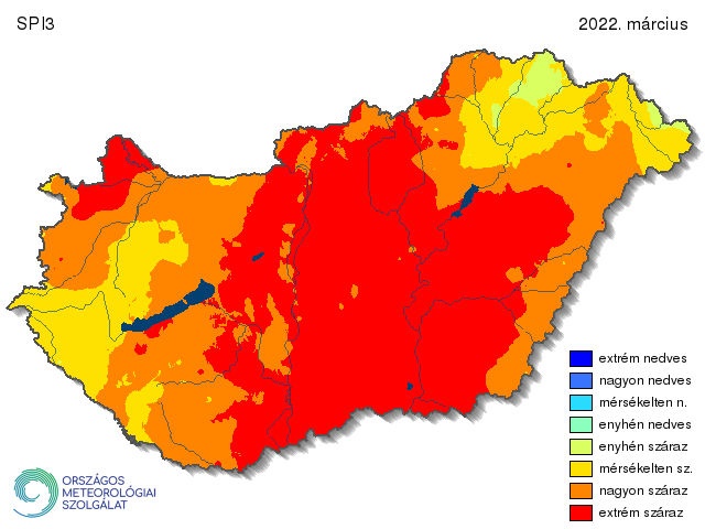 Aszály szempontjából a tavaszi időszakot összességében legjobban az SPI3 májusi eloszlása jellemzi (12. ábra). A 2022-es tavaszi csapadékösszeg jelentősen elmaradt a szokásostól, főként a Tiszántúlon és Bács-Kiskun megye déli részén jelentkezett nagyobb csapadékhiány, ezeken a területeken nagyon száraz, valamint extrém száraz feltételek is kialakultak a tavasz folyamán, de Szabolcs-Szatmár-Bereg megye, Hajdú-Bihar megye bizonyos régiói, Jász-Nagykun-Szolnok és Csongrád-Csanád megyék területén is nagyon, vagy extrém száraz állapotok domináltak. Az ország többi részén az enyhén száraz kategória volt a meghatározó. Csupán a Mezőföldön és a Duna-menti síkságon alakult ki nagyobb, összefüggő terület, amely az enyhén nedves kategóriába sorolható.