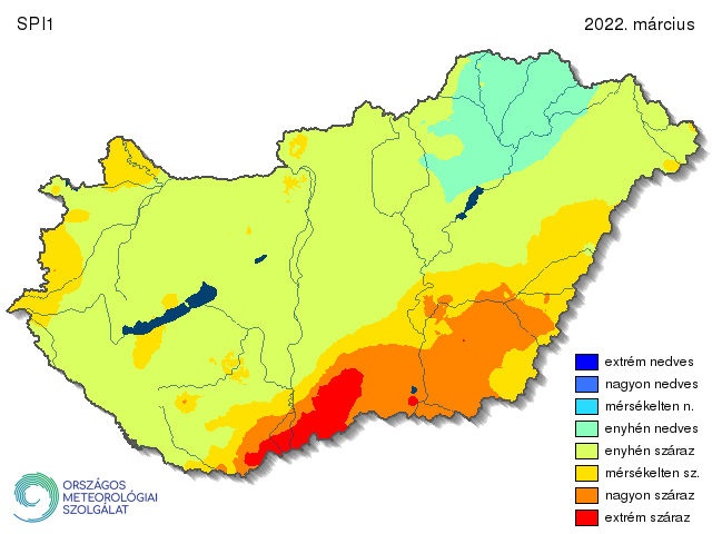 A SPI1 márciusi térképe (13. ábra) nagyon jól szemlélteti a tavasz kezdetét. Extrém száraz feltételek alakultak ki a Bácskai-síkvidéken és a Drávamenti-síkság egy részén, továbbá nagyon száraz feltételek uralkodtak az ország délkeleti részén. Jól látható, hogy az ország túlnyomó részén enyhén száraz vagy ennél kedvezőtlenebb viszonyok uralkodtak, mindössze Borsod-Abaúj-Zemplén megye esetén láthatunk mezőgazdasági szempontból kedvezőbb feltételeket, ami az enyhén nedves kategóriába esett.