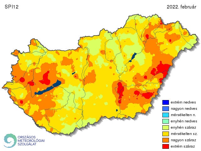 A 461 állomásra számított SPI1 értékek alapján a 2021/2022-es tél hónapjai közül 2022 januárja lett a legszárazabb, bár mutat területi változékonyságot is. A Balaton és a Tisza-tó közé eső országrészek a nagyon száraz kategóriába tartoznak (sőt ezeken belül van több extrém száraz is), míg Vas, Zala és Veszprém megyék legnagyobb részén az enyhén száraz kategória a jellemző. Az SPI egyhavi értékei így mindenhol elérték a meteorológiai aszály kategóriáját. A januári egyhavi SPI-nél viszont érdekesebb a februári kéthavi SPI, mely az év kezdetének aszályosságát mutatja be jól (12. ábra). Itt már csak egy nagyon kis terület tartozik az enyhén száraz kategóriába, az ország nagyjából háromnegyede már nagyon száraznak számít. Az extrém száraz területek is már összefüggőek, az Alföld és az Északi-középhegység jelentős részére, valamint a Dunántúli-dombságra is ez a jellemző.