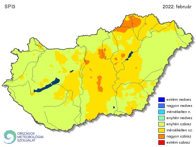 A 2022. februári háromhavi SPI a teljes téli időszak csapadékösszegét veszi figyelembe (13. ábra), amely azt mutatja, hogy a decemberi többlet csapadék tudja enyhíteni az őt követő hónapok hiányát. Ezen az ábrán már csak elszórtan találkozunk a nagyon száraz kategóriával, az ország legnagyobb része az enyhén száraz kategóriába tartozik. Mérsékelten száraz területek ott jelennek meg, ahol a kéthavi SPI extrém száraznak számított: az Északi-középhegységben és az Alföld középső részein.