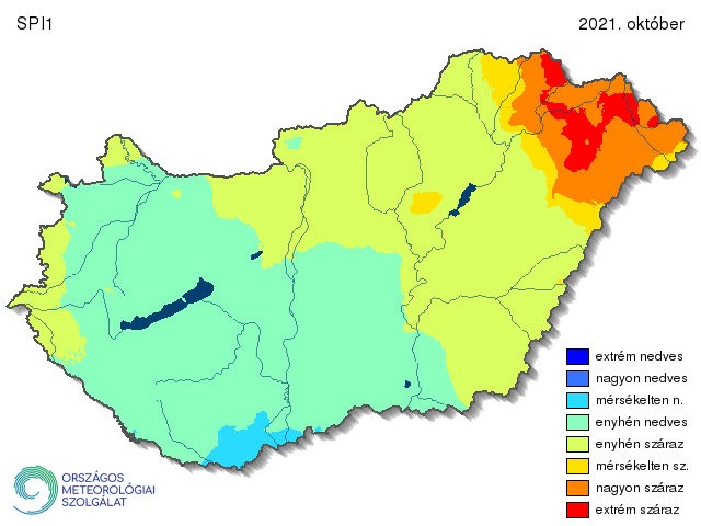Az évszak legszárazabb hónapjában, októberben a standardizált csapadékindex (SPI) egyhavi értékei az ország nagy részén elérték a meteorológiai aszály kategóriáját. Ekkor szinte mindenhol kevesebb csapadék hullott a megszokottnál, északkeleten még a szokásos érték 10%-át sem érte el a csapadék mennyisége. Itt jelentek meg a nagyon száraz és az extrém száraz kategóriák. A Tiszántúlon és az Északi-középhegységben az átlagos csapadéknak csak a 10-50%-a hullott, ezek a területek az enyhén száraz kategóriába tartoztak. A Duna-Tisza köze és a Dunántúl – ahol a csapadékösszeg már közelített a normálhoz – enyhén nedvesnek számít. Csupán a Dunántúl déli részén, egy kisebb területen jelent meg a mérsékelten nedves kategória (12. ábra).