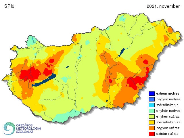 A novemberi SPI6 már figyelembe veszi a 2021. június és 2021. november között érkező csapadékot, így képet kaphatunk közel a teljes második félévben lehullott csapadékmennyiségről. Jelentős hiányokat találunk ebben az időtávban az ország egész területén, szinte csak száraz kategóriák azonosíthatóak. Főként az enyhén száraz kategória jellemző, de nagyon és extrém száraz területeket is találunk. Utóbbira példa a Kemeneshát, a Bakony-vidék, valamint a Békési-sík és a Berettyó-Körös-vidék (14. ábra). Enyhén nedves terület csak kevés volt: a Dunántúl déli részén, Mosonmagyaróvár környezetében és elszórva foltokban jelennek meg.