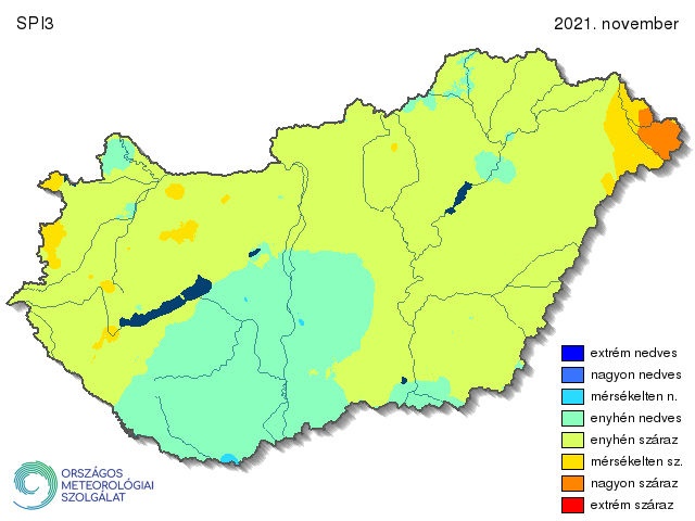 A 2021 novemberi háromhavi SPI a teljes őszi időszak csapadékösszegét veszi figyelembe (13. ábra), amely azt mutatja, hogy a novemberi csapadék egész jól ki tudta ellensúlyoznia a korábbi, szeptemberi és októberi hiányokat. Bár még az ország nagyobbik fele tartozott valamelyik száraz kategóriába, megjelentek enyhén nedves területek is (Dunántúl déli része, Duna-Tisza-köze, Mosonmagyaróvár környezete). A száraz kategóriák között is főképp az enyhén száraz dominált; mérsékelten vagy nagyon száraz területeket csak keveset találunk (ilyen a Beregi- és a Szatmári-sík).