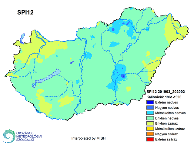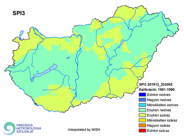 A 2020 februári háromhavi SPI a teljes téli időszak csapadékösszegét veszi figyelembe (13. ábra), amely azt mutatja, hogy az aszályos január ellenére a decemberi és februári csapadék nagy területen ki tudta egyenlíteni a korábbi hiányt. Enyhén száraz kategóriába tartozó területek a Kisalföldön, a Csereháton, illetve a Dunántúl és az Alföld déli részén voltak (13. ábra).