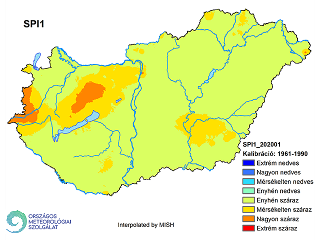 A 461 állomásra számított SPI1 értékek alapján a 2019/2020-as tél hónapjai közül 2020 januárja volt egyedül annyira csapadékszegény, hogy az egyhavi SPI érték országos átlagban csaknem elérte a meteorológiai aszályhoz szükséges -1-es küszöbértéket. Területileg a nagyon száraz kategóriába tartozó területek Vas és Veszprém megyében voltak (12. ábra), míg az ország többi része enyhén vagy mérsékleten száraz kategóriába tartozott.