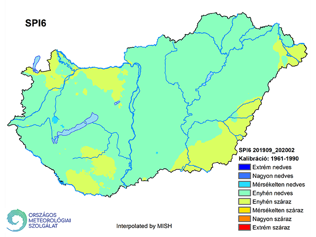 A februári SPI6 már figyelembe veszi a 2019. szeptember és 2020. február között érkező csapadékmennyiséget, így képet kaphatunk az őszi gabonáink fejlődését meghatározó vízbevételről. Jelentős hiányokat ebben az időtávban nem találunk az ország területén. Enyhén száraz területek Győr-Moson-Sopron, Komárom-Esztergom, Baranya, Békés és Szabolcs-Szatmár-Bereg megyék területén azonosíthatók (14. ábra).